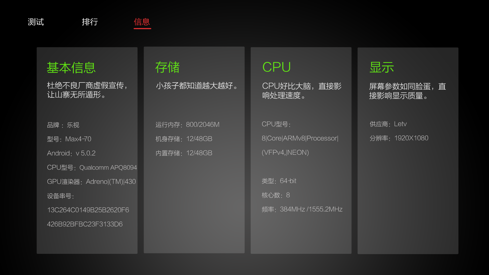 很多人会担心买到假货或者厂商虚假宣传,用户通过信息页面内的各种参数,就能够了解电视的硬件配置。另外,信息页面除了能够帮助消费者,还能够对电视行业起到自律的效果。