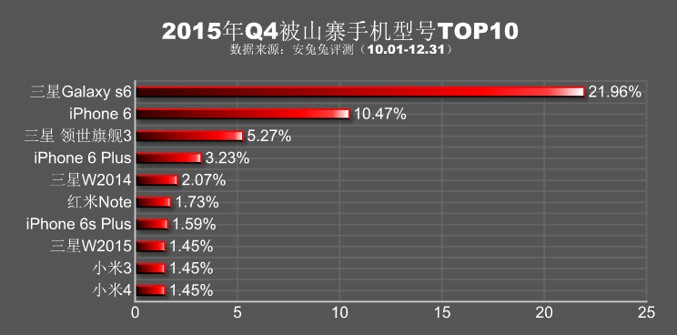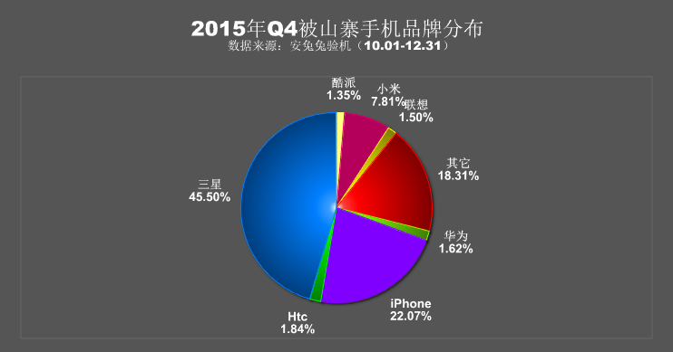 根据安兔兔的数据统计,2015年Q4季度山寨机总量有所下降,山寨机的品牌、型号相比前3个季度有着明显变化。iPhone被山寨的数量在Q4表现明显,三星被山寨的数量依然最多,小米相比前3季度有着明显下降。具体的山寨机分析大家可以看这篇报告。