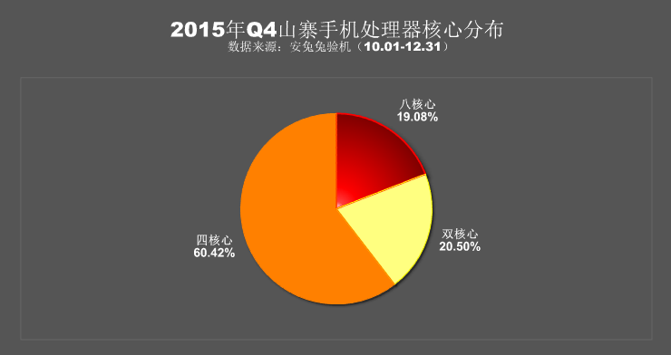 在处理器核心分布方面,四核心的占比依然最高,达到了60.42%。八核心和双核心的占比分别为19.08%和20.5%。目前绝大多数的山寨机搭载的都是联发科的方案,这跟联发科低廉的价格有着直接关系。
