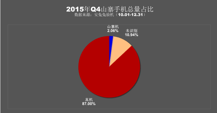 2015年Q4季度总验机数量为5073591,其中山寨机数量为100384 (数据中不含未知机型,不含测试结果未提交机型)。