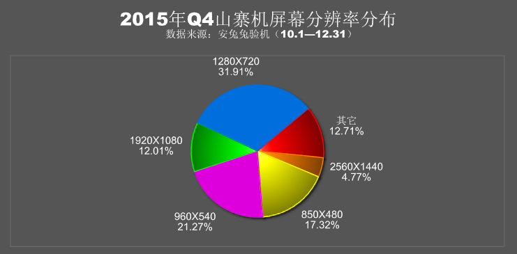 在屏幕分辨率方面,720P的分辨率依然是山寨机厂商的首选,960X540、850X480这些小分辨率的比例有所上升。1080P的比例下降到了12.01%。在这些比例分布中,笔者将1024X600、800X800、1334X750等不常见屏幕分辨率统统归到了“其它”这个分类,这个比例达到了12.7%。