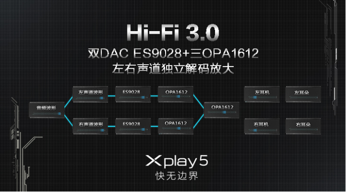 而“快无边界”Xplay5旗舰版的Hi-Fi 3.0全新架构,则通过双ES9028+三OPA1612的逆天配置和左右声道独立解码放大的方案、配合双时钟晶振和二级供电,使手机达到左右声道独立解码放大,完全吻合录音室录音规则和耳机输出方式,最大程度上还原了音乐本身的元素。最终使得Xplay5旗舰版的理论数据达到了信噪比124dB、动态范围122B、左右声道分离度115dB、谐波失真-106dB。也使得vivo又一次带领行业实现了手机Hi-Fi的新突破,又一次成为手机Hi-Fi的巅峰。