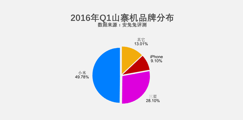 对比2015年Q4的山寨机报告,小米以49.78%占比再次排到了榜首,而三星、iPhone的占比均有所下降。通过图表我们可以看出,其它品牌的山寨机非常少,它们的总量加在一起才13.01%。
