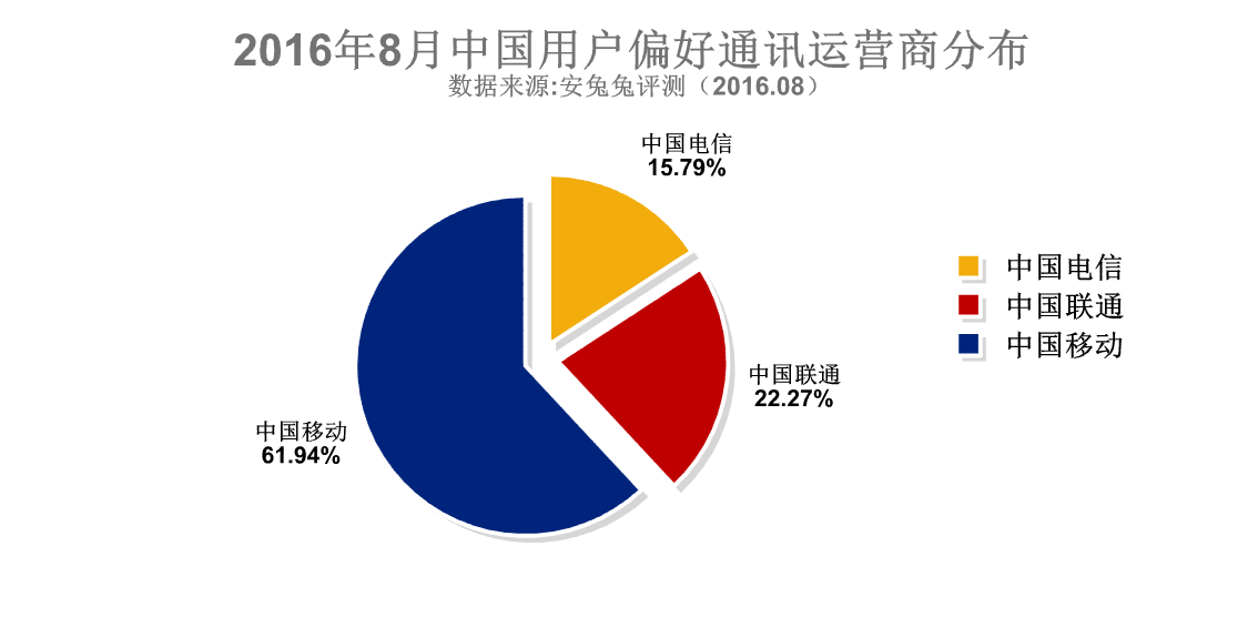 果不其然,作为通讯圈内龙头老大的中国移动以绝对优势成为8月份最受手机用户们喜欢的运营商。不过,九月份iPhone 7发布,联通和电信的合约机对很多用户来说具有很大的吸引力,相信之后的运营商分布数据还会出现一定的此消彼长,但是中国移动的老大地位殊难撼动。