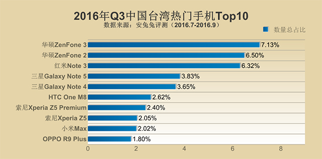 在中国台湾地区,当地的本土手机品牌优势明显,比如华硕,HTC。同时,日系的索尼手机,韩系的三星手机也颇受台湾人民的喜爱。另外,国产手机OPPO R9 Plus在台湾市场占比达到了1.80%,其与OPPO赞助台湾综艺节目是分不开的。不错的产品,辅以有效的市场推广,必然是水涨船高。