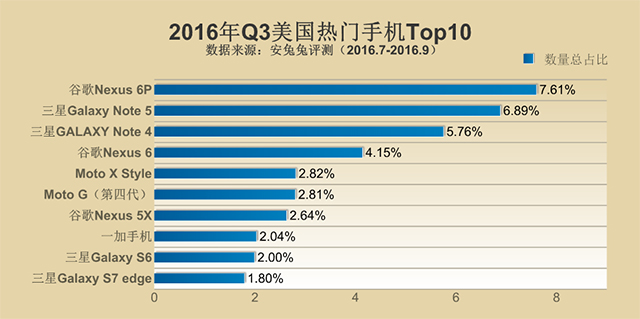 至于美国市场,三星手机占据了Top10榜单中的4个席位,其它榜单中常见的Note 5再度上榜。不过,谷歌Nexus 6P则位居榜首。同时,两款Moto手机:Moto X Style、Moto G(第四代)也有不错的市场表现。另外提一句,国产厂商一加推出的一加手机在美国市场依然有着不错的占比。