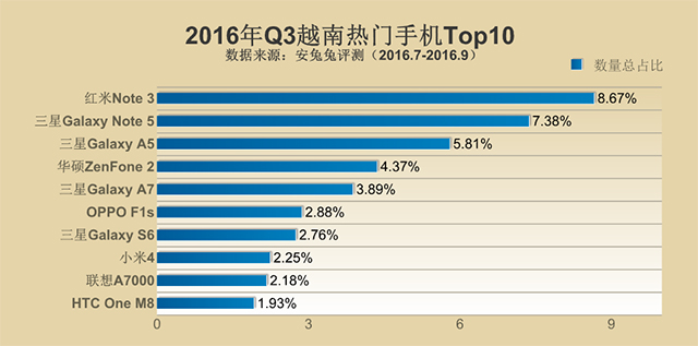 至于越南热门手机Top10,则主要被国产手机和三星瓜分。同时,我们也可以看到,越南用户不仅热衷于红米Note 3这样的高性价比机型,也青睐三星Galaxy Note 5、S6、HTC One M8这样的高端产品。
