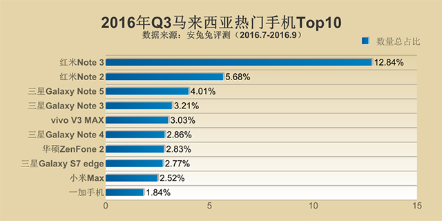 与越南相似,马来西亚的热门手机依然以国产手机和三星手机为主。就产品档位来说,高、中、低三档都有,而且大屏手机极受欢迎,三星Galaxy Note 3、Note 4、Note 5、小米Max等大屏手机市场占比均突破2%。不过,马来西亚本土手机品牌则未见到。
