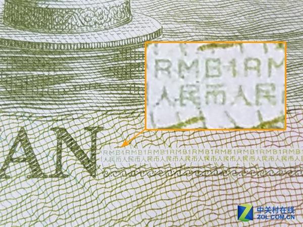 在放大之后可以看到上面一行是“人民币”首字母“RMB”和阿拉伯数字“1”的无限循环,下面则是“人民币”三个字。