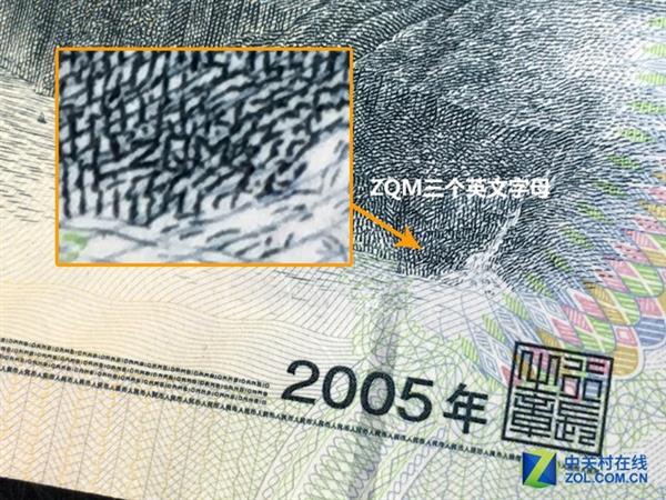 想要发现10元面额人民币背后的名字比1元人民币上的字母难多了,举着这张钱在灯光下苦苦寻找好久才终于看到三个人名缩写大写字母“ZQM”。