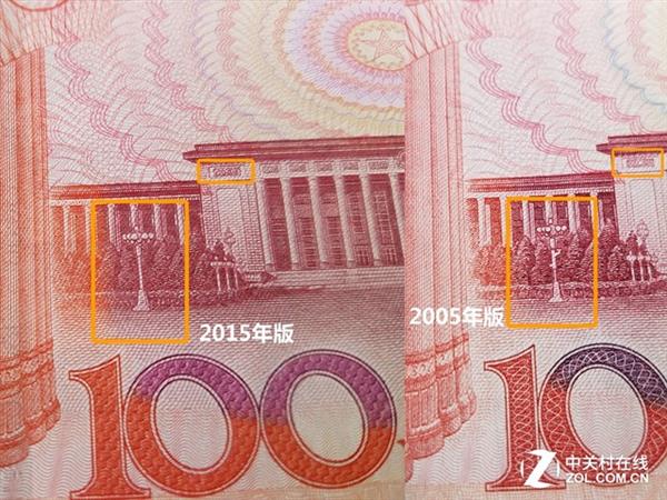 2005年版和2015年版100元纸币背面两处不同