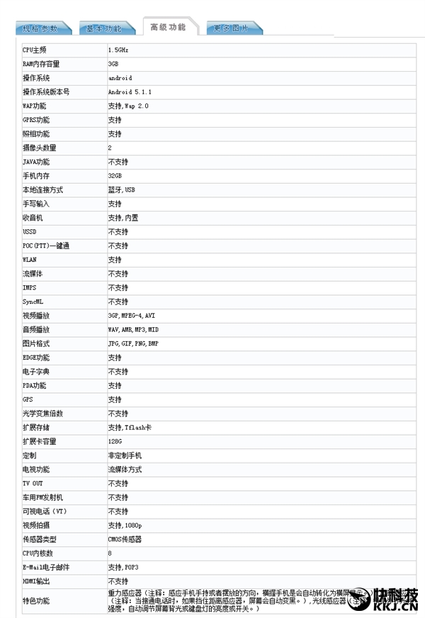 规格方面,它配备了5.5寸1080p屏幕、1.5GHz八核处理器(疑似联发科MT6753 A53/Mali-T720MP3)、3GB内存、32GB存储(可扩展)、双卡双待全网通、安卓5.1.1操作系统。