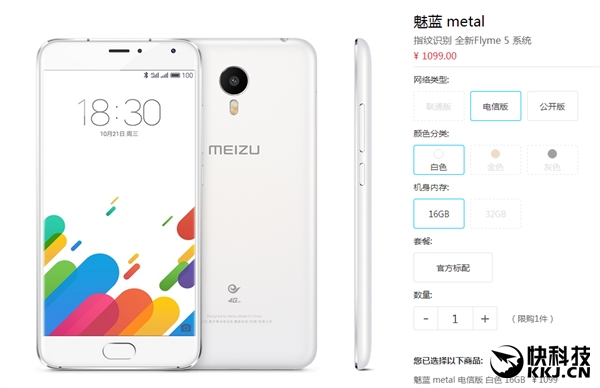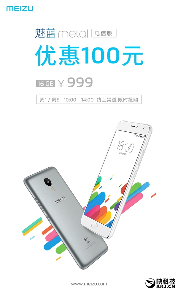 目前,魅蓝metal公开版999元,电信版1099元。魅族表示,从3月28日起,魅蓝metal电信版每周一和周五10:00-14:00限时优惠,直降100元!消费者可在官网、天猫、京东购买。