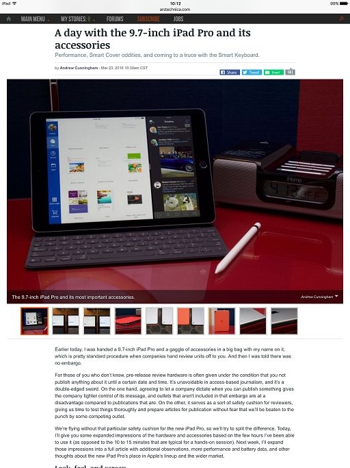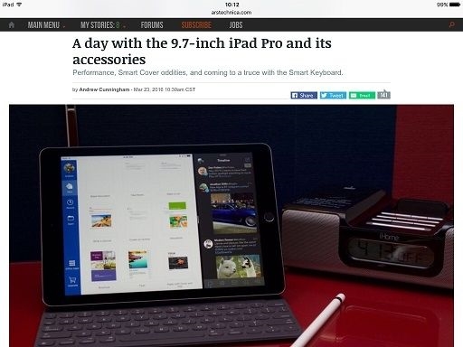 12.9寸的iPad Pro完美地解决了这个问题。它的有效分辨率相当于1366x1024的传统显示器,纵向显示内容与24寸1080p显示器非常接近。如果需要更大的纵向显示空间,iPad Pro竖起来观看时字体大小刚好与9.7寸iPad横向显示模式下的字体一致,阅读并不费力;而此时屏幕的有效分辨率是1024x1366,显示的网页内容与1440p的桌面显示器接近,效果是相当震撼的。