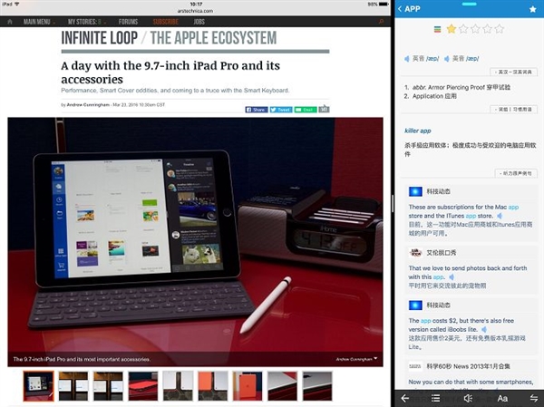 大屏幕对同屏多任务的操作也是非常便利的,在12.9寸屏幕上可以一边打开一个显示完整的网页,另一边使用QQ、微信或者笔记、字典之类的App。9.7寸iPad上分屏功能的体验就差很多,打开两个应用后基本上哪个都没有足够的显示空间了。