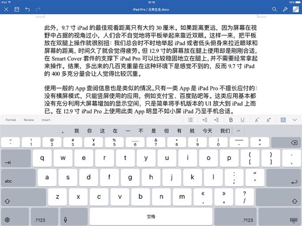 9.7寸iPad的虚拟键盘不仅将许多键位放在了不同的页面里,在横屏状态下一调出就占据了一半的屏幕空间,一个键盘就把输入框遮挡得差不多,用起来简直就是噩梦。对于少量文字输入任务,诸如写微博、发微信、简单的事项记录乃至短文撰写来说,大屏iPad的屏幕键盘足以取代实体键盘了。