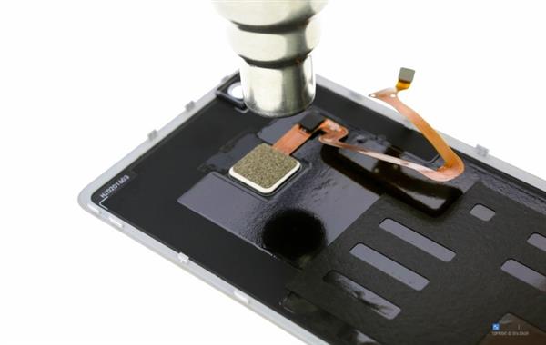 ▲ 玻璃四周被一圈「塑胶装饰框」包裹,指纹识别 FPC 出现藕断丝连