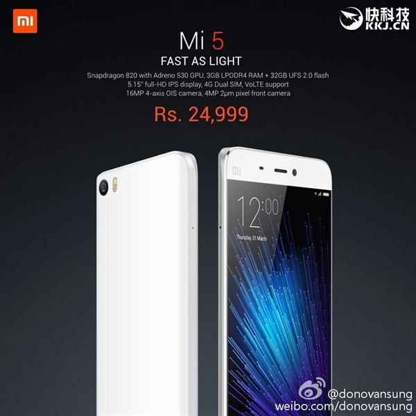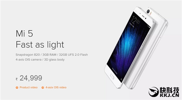 小米5在国内有1999元标准版、2299元高配版、2699元尊享版三种配置版本,而在印度首发的只有标准版,配备骁龙820 1.8GHz处理器、Adreno 530 510MHz图形核心、3GB LPDDR4-1333内存、32GB UFS 2.0存储,不过黑色、白色、金色三种色调倒是都有。
