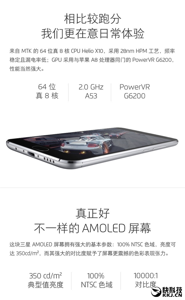 其他规格不变,还是金属机身、5.5寸1080p屏幕、3GB内存、16GB存储、500万像素前置摄像头、3150mAh电池、mTouch 2.0指纹识别,网络制式支持移动/联通双4G,机身颜色只有白色。