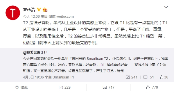 距离锤子T2发布已经超过3个月了,今日,罗永浩在微博发声:(锤子T2)仍然是目前市面上能买到的最漂亮的手机。