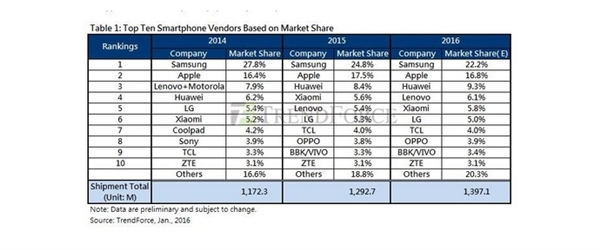 从TrendForce所公布的调研数据,我们似乎可以得出这样的结论:国产智能手机厂商已经由弱变强,在全球竞争中展示出了强大合力,无论是在合计出货量、市场份额都展示出了不俗的竞争力。可以说2015年,国产智能手机在出货量上又有了长足的进步,国产品牌的增长势头迅猛,又是大获丰收的一年。