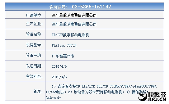 在工信部认证中心,一款型号“S653H”的飞利浦新机刚刚拿到了入网许可,证件照和部分规格也一并曝光。