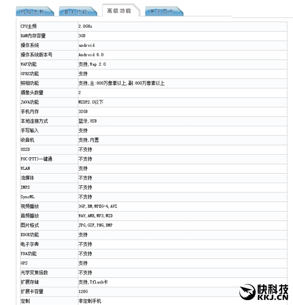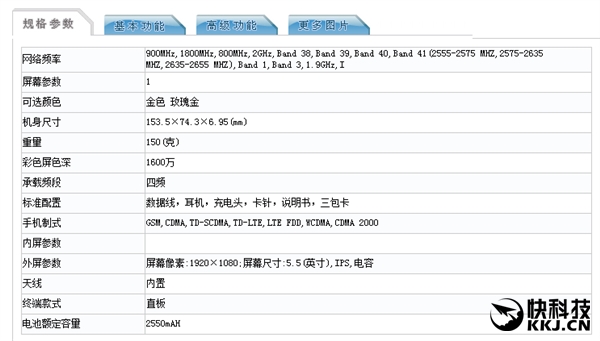配置方面有5.5寸1080p屏幕、2GHz八核处理器(可能是联发科Helio P10)、3GB内存、32GB存储(最大扩展128GB)、800+800万像素前后摄像头、2550mAh电池、安卓6.0操作系统。