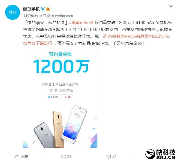 不俗的配置和设计加上低廉的价格给魅蓝note3大卖打好了基础,只要魅族供货有保障,魅蓝note3应该会取得不俗的成绩。其中,最明显的例子就是今天晚上魅蓝手机官方微博宣布,截止目前魅蓝note3预约已经超过了1200万。