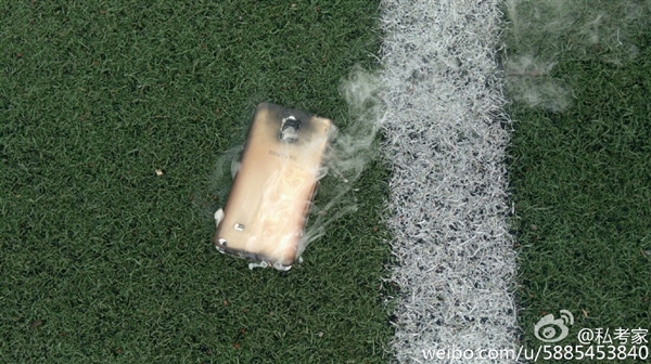 从现场照片来看,Note 4自燃冒烟的一幕也被拍下,塑料后壳已经烧化,电池也有一定变形。
