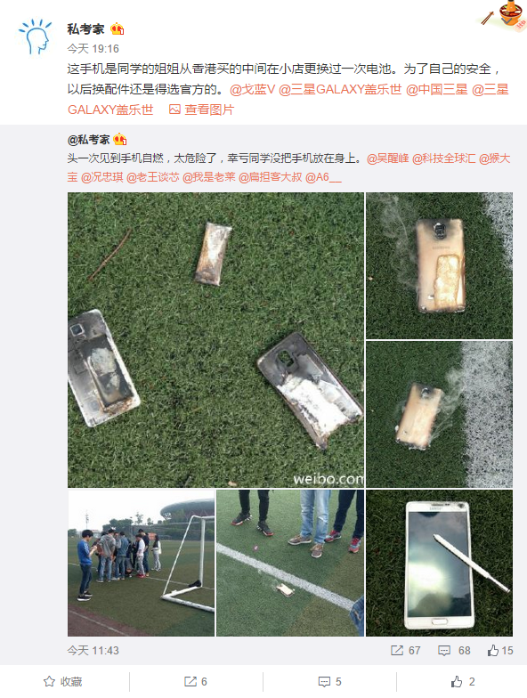 从原博主表达的意思来看,这部Note 4使用了非原装电池导致了自燃,所以在此我们提醒大家,手机配件最好选择原装的,避免潜在危险。