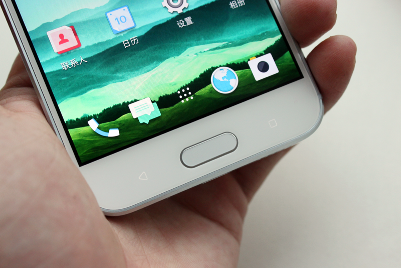 需要说明的是,HTC的物理Home键并不支持按压,但触摸可以进行指纹识别或者回到桌面。这颗Home键的设计略低于正面玻璃面板,四周镶嵌着金属环装饰,看起来还是比较精致。值得一提的是,其指纹识别功能的识别率很高,而且响应速度很快。可惜的是,HTC 10目前的指纹识别功能仅可以用于屏幕解锁,而并不支持隐私加密或者支付宝、微信等软件的指纹支付。