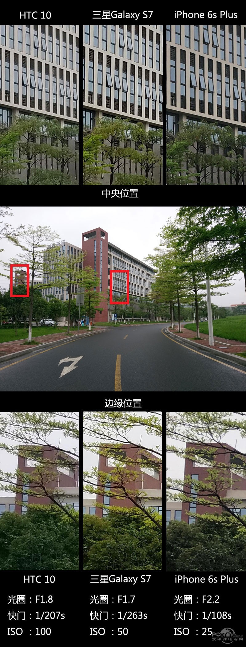 在画面色彩上面,HTC 10的饱和度最高,苹果iPhone 6s Plus画面风格比较清淡,而三星Galaxy S7的画面表现中性,其实也无所谓好坏,萝卜青菜各有所爱,看大家喜欢什么风格。不论是中央位置还是边缘位置,三星Galaxy S7的表现都是最好,但3台机型都出现了一定的紫边现象。