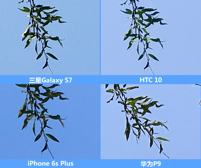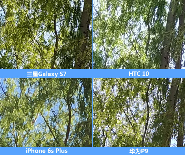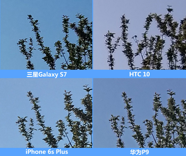 点击放大查看可以发现,对比天空的蓝色和树叶的绿色,四款手机的色彩调校风格还是有较大区别的。整体来说,iPhone 6s Plus的天空更蓝,华为P9(标准模式)整体色彩较为暗淡。再来对比一下样张100%截图的细节表现。