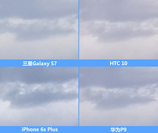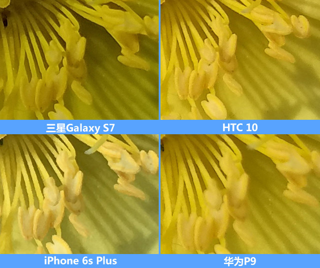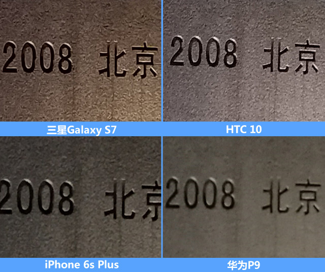 测试结果:虽然四款手机像素都号称是1200万,但从细节来看分辨率表现参差不齐,三星Galaxy S7延续了此前测试中高分辨率表现但明显锐化过度,HTC 10的算法还有待加强,iPhone 6s Plus效果比较讨人眼喜欢,华为P9还得努努力。