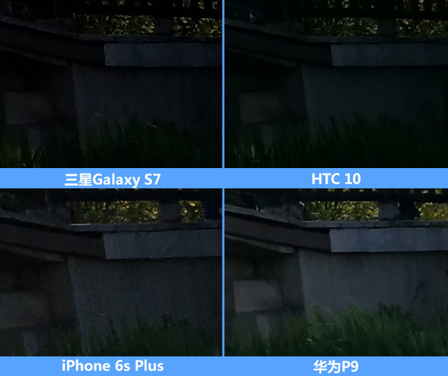 再来看下面一组样张,相同场景下,HTC 10的亮度最高,其次是三星Galaxy S7,iPhone 6s Plus和华为P9亮度相似,细节部分100%截图查看暗光噪点表现。