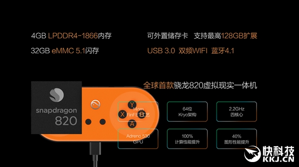 该VR头盔搭载高通骁龙820+4GB LDDR4内存,考虑到了处理器、电池和PCB等元器件的发热和重量问题,设计人员将上述部件置于手柄之中,以换得额头部位的轻巧。