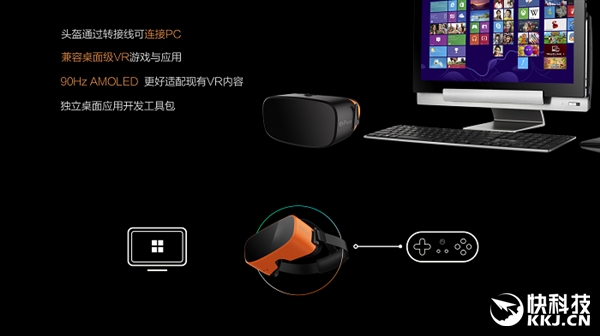 这款设备与HTC Vive类似,配备了两块分辨率为1200x1080的AMOLED显示屏,最高支持90fps刷新率。此外,其视角102°,动作延迟保证在20ms以内。