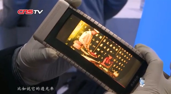 这是一款柔性的手机,它可以做到完全的柔性,它可以戴在手上。石墨烯是一种非常好的材料,它有很多很好的优点,比如说,它的透光率比传统材料的透光率更高,所以它(石墨烯显示屏)的显示更加清晰,另外,石墨烯的电阻率比传统材料电阻率更低,所以它(石墨烯显示屏)触控起来更加灵敏。