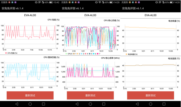 上图为华为P9 Plus的稳定性测试结果——CPU性能在50%—100%之间波动,CPU的频率在800MHz-1600MHz之间波动,手机的电池温度稳定在40度左右。海思麒麟955的稳定性表现不错。