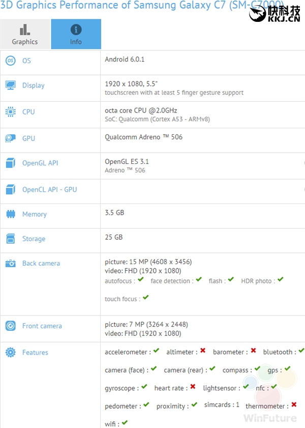 在这份配置单中,首先是确认了其定名Galaxy C7(SM-C7000)。C7拥有5.5寸1080P显示屏、8核2GHz处理器(应该是骁龙625)、GPU为Adreno 506,4GB内存、32GB ROM、前后摄像头分别为800万和1600万。