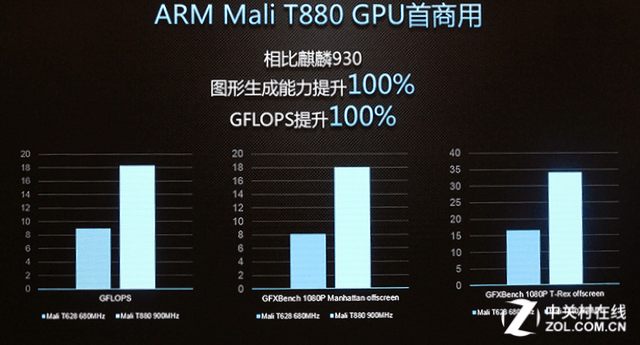 GPU方面,其用全新的Mali-T880图形处理器取代以往的MaliT-628MP4,主频高达900MHz,基于16纳米FinFET+工艺的Mali-T880在同频率下性能是Mali-T760的1.8倍,同时功耗减少40%。与麒麟930相比,麒麟950图形生成能力提升100%,GFLOPS提升100%。存储性能方面,麒麟950支持双通道LPDDR4内存、UFS 2.0、eMMC 5.1、Category 10 LTE、USB 3.0、蓝牙4.2以及最高4200万像素摄像头模块等顶级标准。