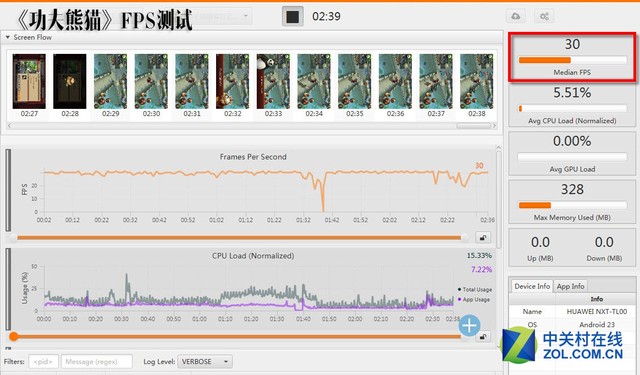 对于部分像《功夫熊猫》这样限定30fps帧数的动作类手游来说,华为Mate 8也完全能够发挥其100%的游戏性能,而实际体验当中30fps无论是普通场景还是多NPC参加的对战都很流畅;FPS监测曲线当中看出除了载入CG的时间段之外,长时间运行也不会出现降帧的情况。