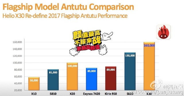 此外,从微博网友@潘九堂曝出的图片来看,联发科自称Helio X30的安兔兔跑分可达16万左右,从目前曝出的消息来看,联发科要逆袭了。