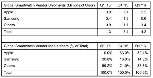 Apple Watch的具体销量没有公布,但是根据调研机构Strategy Analytics给出的数据,Apple Watch情况同样不佳,今年头三个月只卖了220万部,相比于去年第四季度的510万部锐减了多达57%。