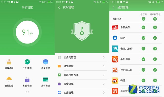 360手机f4有360手机卫士,魅蓝3有手机管家,相信这个老面孔用过Flyme系统的人十分了解,时不时进来给系统加个速、清理个垃圾很方便。另外,手机管家为用户直观地提供了权限管理页面,现在大多App都会占领我们的通知栏,甚至推送一些无节操的广告,我们在这里可以关闭不想看到的App通知。二者功能大同小异。