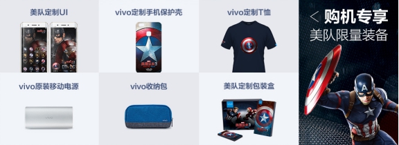 从目前开始,只要在vivo京东官方旗舰店(https://sale.jd.com/act/vGWKogOy2nbPpQ.html)预定美国队长Xplay5旗舰版的用户,都有机会抽取美国队长Xplay5旗舰版、美队玩偶、新秀丽背包、100元优惠券、30元优惠券、10元优惠券和《美国队长3》电影票等礼品。而最终购买了美国队长Xplay5旗舰版的用户,还将获得vivo原装P50移动电源、vivo收纳包、美队定制手机壳、美队定制T恤、半年碎屏保和半年延保等超值礼品,享有京东极速物流和30天无理由退换货等,并将可以进行免息12期分期或24期费率五折优惠,晒单更有其他好礼相送,非常超值。