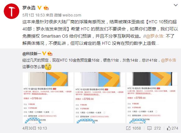 当然,简配并不是关键,关键在于有网友统计了京东的HTC 10 Lifestyle三色预定量,加起来只有41台(金色预定量16台,银色11台,灰色14台)。而锤子科技创始人罗永浩转发微博,并对HTC 10预定量评论道:不了解具体情况,不便乱讲,但可以肯定的是HTC没有在预约数字上造假,这在今天浮躁的手机行业,已经是相当难得的高贵品质了。