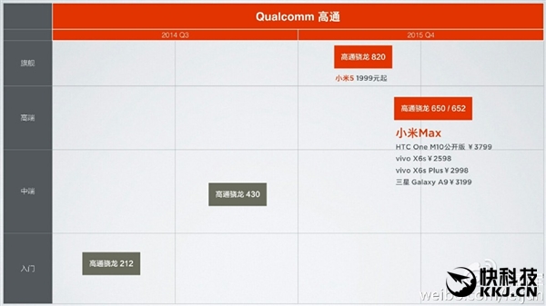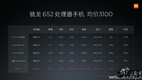 价格方面,目前搭载骁龙652处理器的手机均价在3100元,言下之意就是自家的小米Max卖1699(骁龙652版)是非常厚道的。