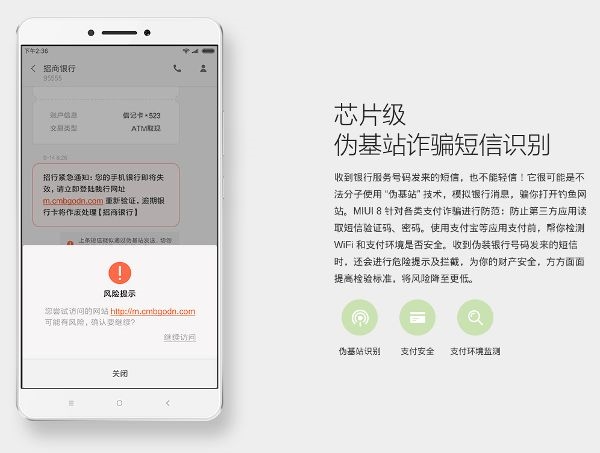 除了芯片级识别之外,MIUI8还在软件上有三重保护,分别是:短信程序识别伪基站短信、识别钓鱼网址、浏览器检测恶意网址。