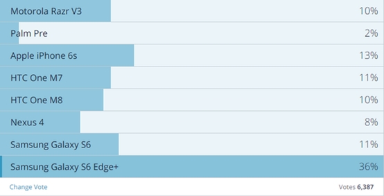 从Android Authority获得的6000多张投票来看,三星Galaxy S6 Edge+获得了36%的投票,似乎是用户心中最时尚的手机,苹果iPhone 6s则以13%排名第二,HTC One M7及三星S6并列第三。不知大家是否认同这个结果,也不妨在评论中聊聊你认为最时尚的手机。